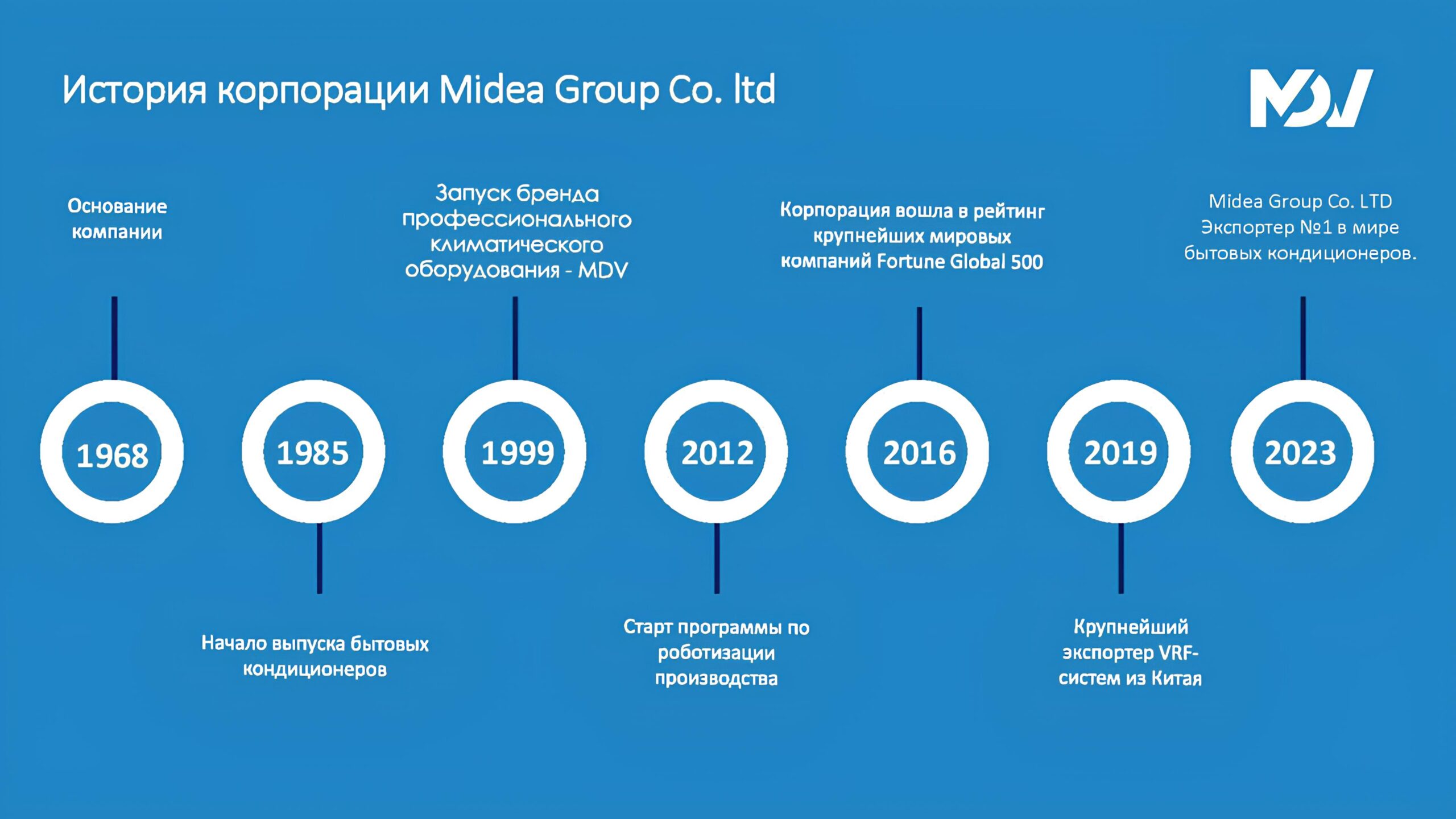 MDV – собственный бренд климатической техники корпорации Midea Group Co., Ltd. Это один из крупнейших производителей бытовой техники в мире, выпускающий широкий ассортимент оборудования – от микроволновых печей и холодильников до мощных климатических систем, обслуживающих высотные здания, стадионы и аэропорты. Помимо бытовой техники и кондиционеров, компания выпускает промышленных роботов, разрабатывает системы автоматизации производства и технологии инженерного обеспечения зданий, изготовляет лифтовое и эскалаторное оборудование.